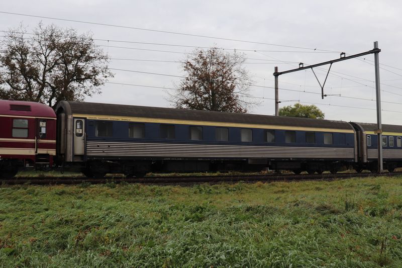 De 189 105 rijdt met de GreenCityTrip door Duiven richting Arnhem en verder naar Amsterdam en Breda. Op de foto staat een rijtuig van het type WLABm met het UIC-nummer 61 81 70-70 010-7. 23 oktober 2021. © TreinenInNederland.nl |