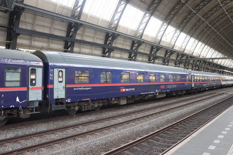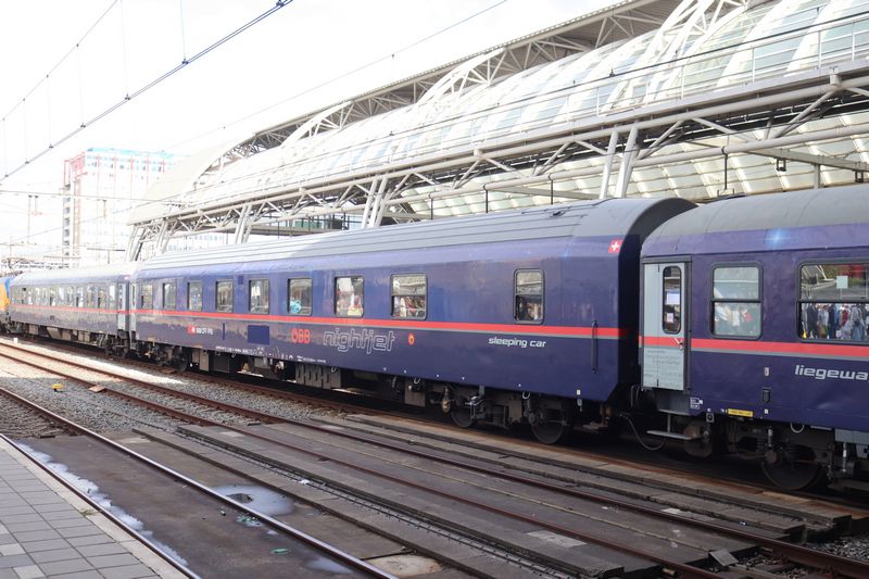 De NSI 6193 931 staat met een NightJet uit Zürich op zijn eindbestemming, Amsterdam Centraal. Op de foto is een rijtuig van het type WLABmz met het UIC-nummer 61 81 71-71 462-8. te zien.