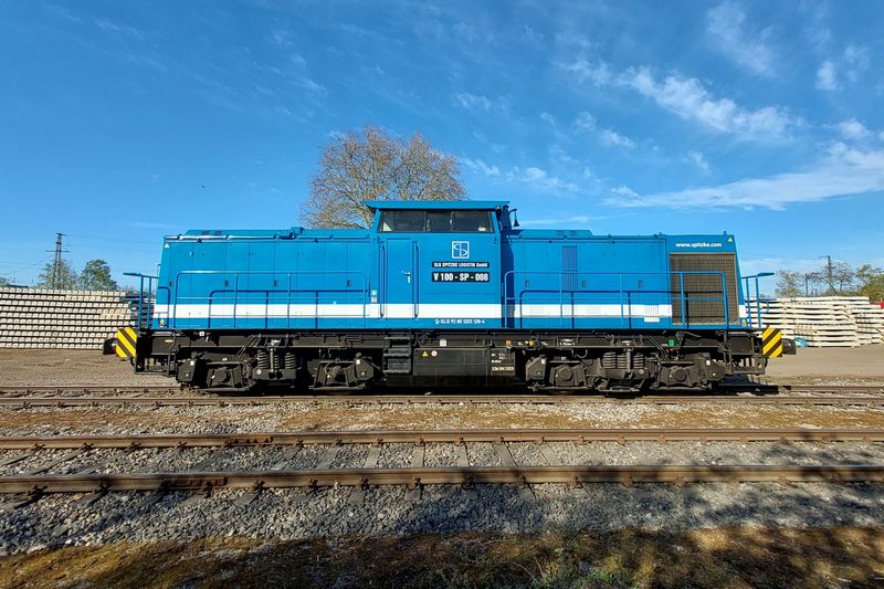 De Spitzke V100-SP-008 staat voor de werkzaamheden aan het derde spoor in Emmerich opgesteld. 5 april 2025. © TreinenInNederland.nl |