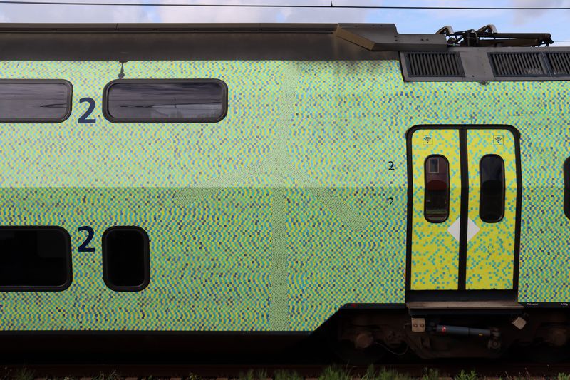 De binnenkant van de bovendieping van de trein is voorzien van wolken en windmolens. |