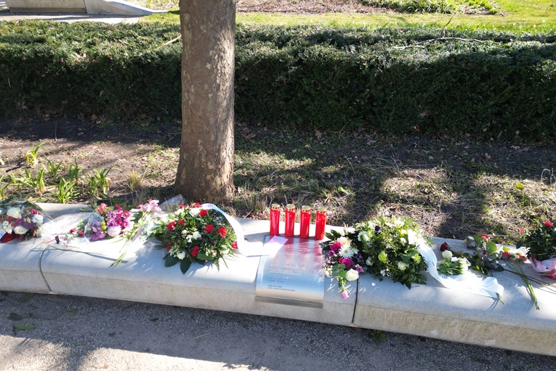Vandaag leggen na de minuut stilte familieleden, hulpverleners en wijkbewoners bloemen op een van de bankjes van het monument. Op dat bankje staan ook vier kaarsen, één voor elk van de slachtoffers van de tramaanslag. Foto's: © RegioNieuwsUtrecht.nl |