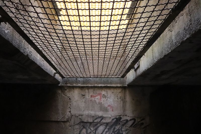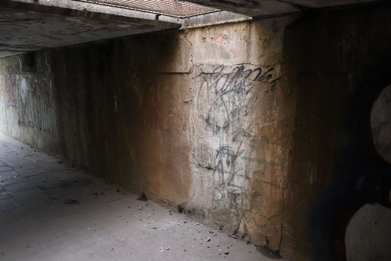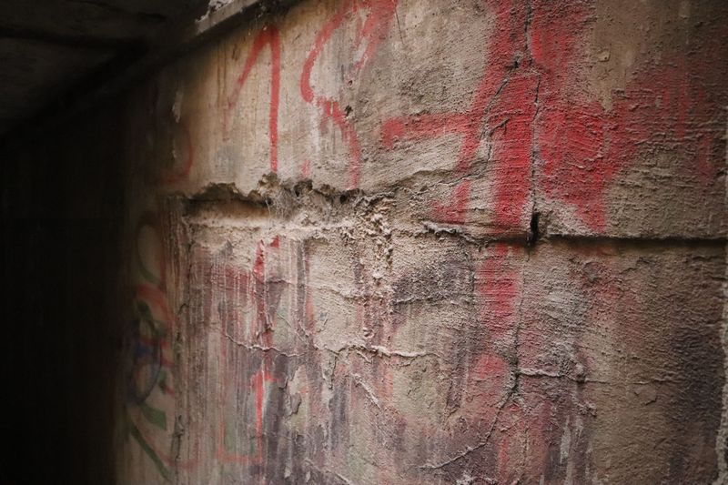 De scheuren in de voetgangerstunnel die onder het spoor doorloopt. |