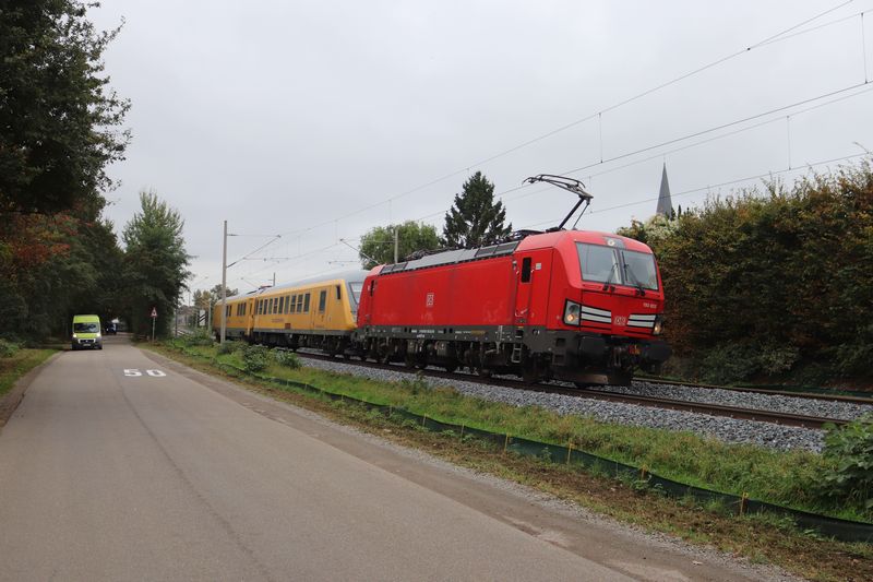 DB 193 033 met de DB Netz meetrijtuig 99 80 93-60 007-5 en de 99 80 93-60 002-6 langs het Tichelkamp in Elten (D). |