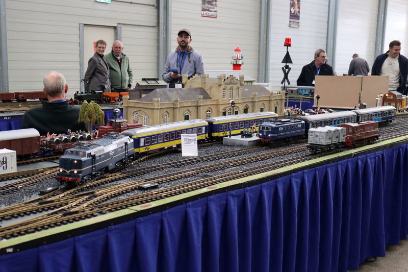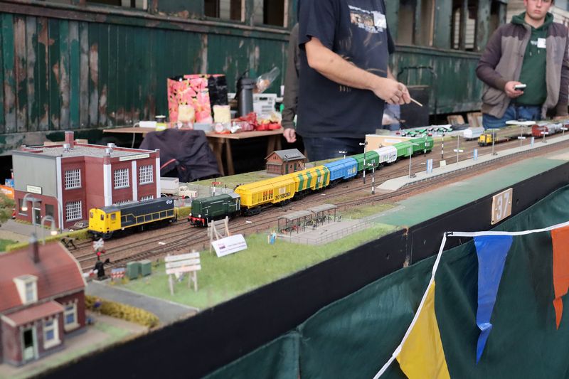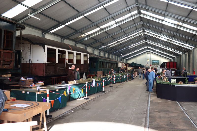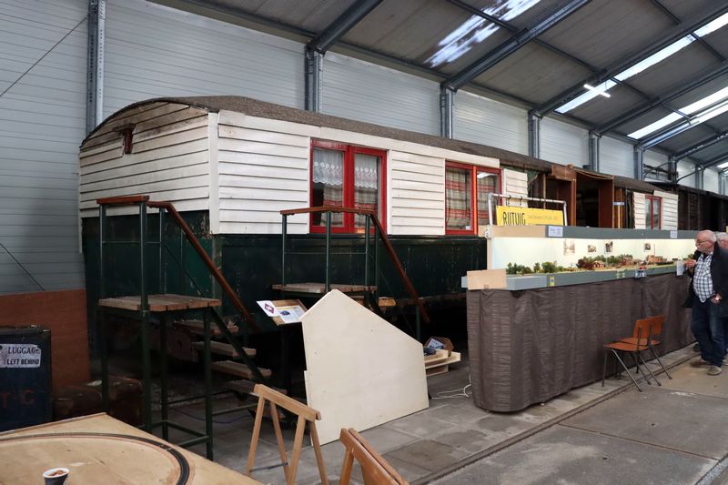 In de loods waren een aantal modelbanen en oude rijtuigen en goederenwagons, die nog op een uitvoerige restauratie wachten, te zien. |