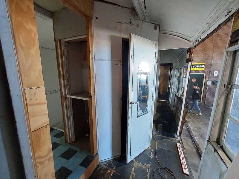 Achterin de werkplaats in Haaksbergen staat rijtuig NCS B101 / NS B1605. |