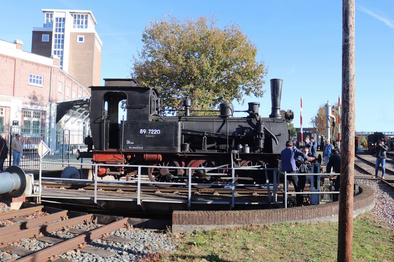 De stoomlocomotief T3 wordt op de draaischijf gedraaid. |