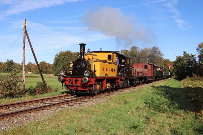 De MBS 6 'Magda' rijdt met een reizigerstrein parrallel aan de Weleweg naar Boekelo. |