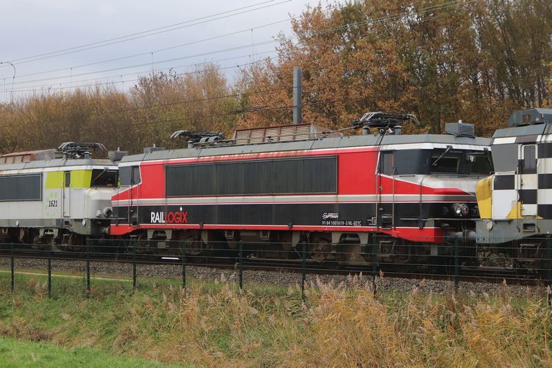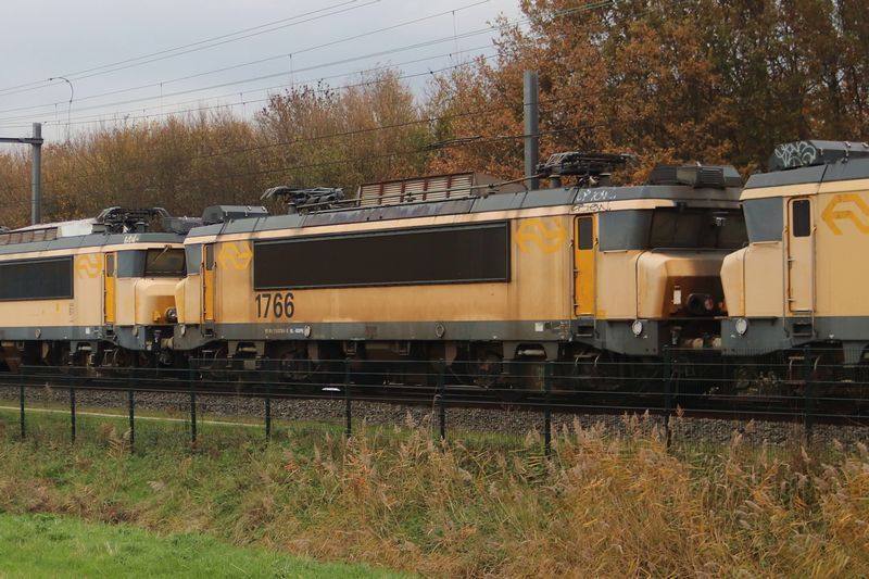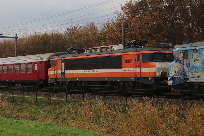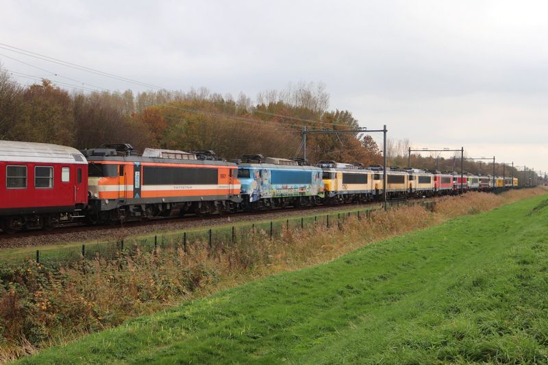 RXP 9901 (ex-NS 1627) met daarachter de hele rits locomotieven. |