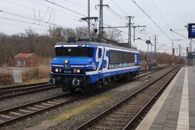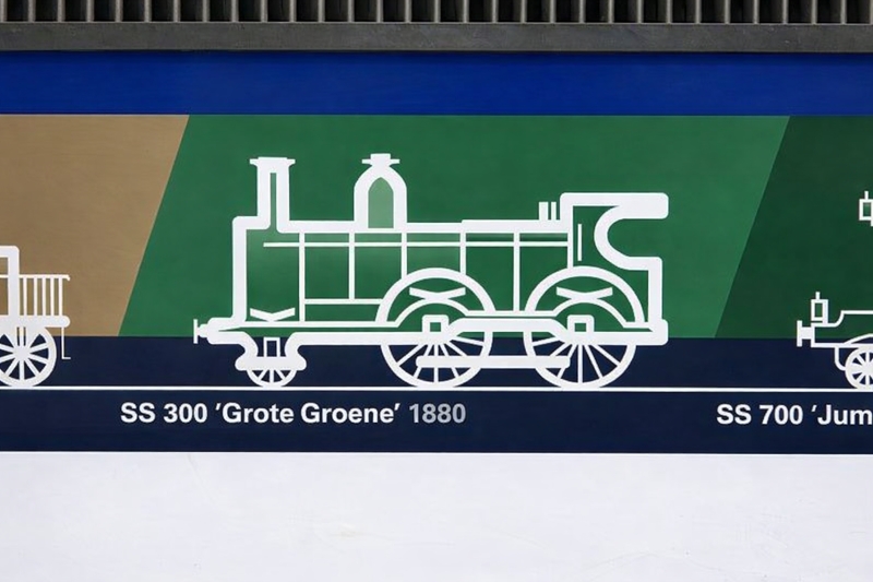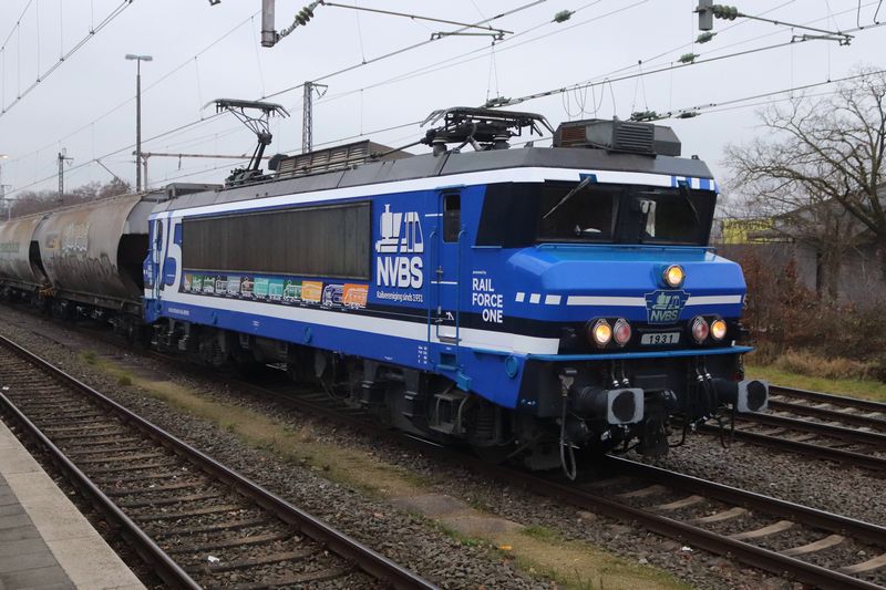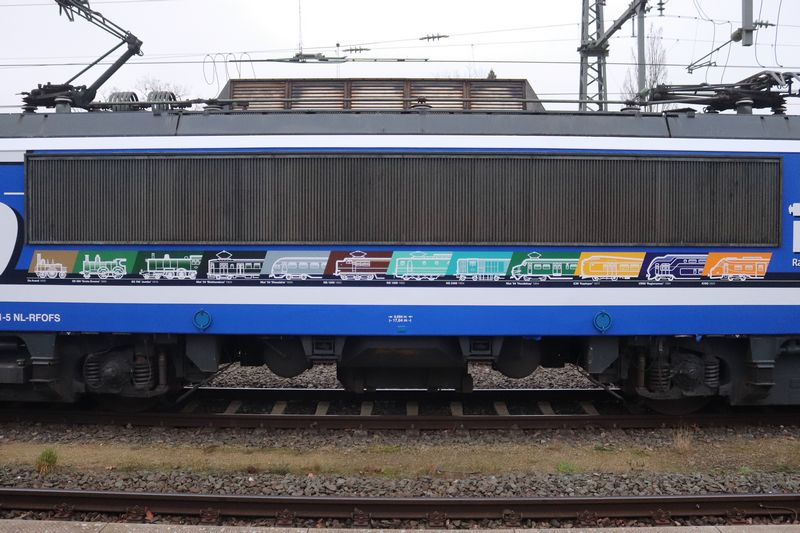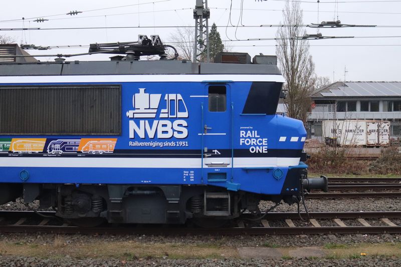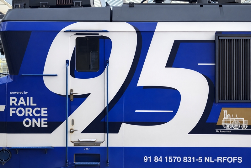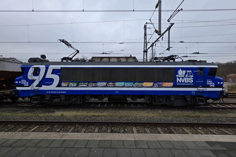 De 1831 van Rail Force One werd uitgekozen om te worden voorzien van de NVBS-huisstijl. De keuze viel op de 43 jaar oude locomotief, omdat de 1831 nog de enige dienstvaardige Nez Cassé is die dienstdoet in het uiterlijk van de vorige vervoerder. De 1831 reed namelijk nog in de oude huisstijl van het in 2017 failliet verklaarde Locon. Hier deed de locomotief dienst onder het nummer 9904. Dit is niet de eerste keer dat de NVBS een locomotief voorziet van bestickering ter ere van haar eigen jubileum. Vijftien jaar geleden bestond de NVBS in 2011 80 jaar en toen werd ook besloten om een locomotief te bestickeren. Toen kreeg de 1254, die op dat moment dienstdeed voor EETC, reclame van de NVBS. Op de ene zijkant werd toen een exemplaar van het blad 'Op de Rails' getoond en op de andere kant het logo van de NVBS. Het blad 'Op de Rails' brengt de NVBS maandelijks uit. Hoewel de 1254 toen ook NVBS-bestickering kreeg, werd de 1831 nu geheel voorzien van de huisstijl van de NVBS. Terwijl achter de schermen druk werd gewerkt aan de grote verrassing, werd op 18 november 2025 de eerste aankondiging door de NVBS gedaan. De jaarlijkse oliebollenrit die altijd in december rijdt, werd dit jaar iets uitgesteld tot begin januari volgend jaar. Zo valt de rit in het begin van het 95ste jubileumjaar van de NVBS. Volgens de aankondiging zou de rit op 3 januari 2026 gereden worden door de Railexperts 9902 'Tommie en Tess' en een verrassingslocomotief met het nummer 951 931. Het nummer 951 931 is opgemaakt uit 95, het aantal jaren dat de NVBS bestaat, en het jaartal dat de NVBS is opgericht: 1931. De verrassingslocomotief werd omschreven als 'een geheel nieuwe verschijning op het Nederlandse spoor'. Gisteren, 12 december 2025, werd bekendgemaakt wat deze verrassingslocomotief 951 931 is. De 1831 werd bij de Stoom Stichting Nederland gepresenteerd in haar nieuwe NVBS-uiterlijk. De locomotief was geheel donkerblauw gemaakt, met op de zijkant groot het getal 95 en het nieuwe logo van de NVBS. Doordat het nummer van de locomotief 1831 is, kon dit met een kleine aanpassing worden veranderd naar 1931. Dit benadrukt het jaar waarin de NVBS is opgericht. Op de zijkant van de locomotief zijn twaalf treinen te zien die belangrijk waren voor de geschiedenis van treinen in Nederland. Op de zijkant van de 1931 zijn van links naar rechts de Arend uit 1839, SS 300 'Grote Groene' uit 1880, SS 700 'Jumbo' uit 1910, Mat'24 'Blokkendoos' uit 1924, Mat'34 'Diesel III' uit 1934, NS 1200 uit 1952, NS 1300 uit 1952, NS 2400 uit 1954, Mat'54 'Hondekop' uit 1954, ICM 'Koploper' uit 1977, VIRM 'Regiorunner' uit 1994 en als laatste de nieuwste trein van NS, ICNG uit 2023. Een dag na de presentatie werd de RFO / NVBS 1931 weer ingezet in de goederendienst en was de nieuw bestickerde locomotief voor het eerst op de baan te zien. De locomotief reed met een schuifwandwagentrein vanuit de Kijfhoek via Rotterdam, Breukelen, Weesp, Amersfoort, Deventer naar Bad Bentheim. Wij hebben de vers bestickerde 1931 tijdens zijn eerste commerciële inzet op de foto en film vastgelegd. Voor alle foto- en filmbeelden geldt: © TreinenInNederland.nl |