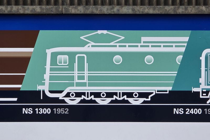De Nederlandsche Spoorwegen wilde tijdens de wederopbouw voor al haar nieuwe elektrische locomotieven en rijtuigen een nieuwe kleur. Deze kleur werd gekozen toen de NS-directeur F.Q. den Hollander en zijn vrouw, mevrouw Den Hollander, in 1949 de Alsthom-fabriek bezochten. Mevrouw Den Hollander zou hebben gekozen voor turkoois; ze wilde vrolijke kleuren en de kleur paste bij haar Wedgwood-servies. Er werd besloten om alle nieuwe elektrische locomotieven en rijtuigen die werden gebouwd te schilderen in het turkoois. Eind 1949 plaatste NS bij het Franse Alsthom een bestelling voor tien elektrische locomotieven die zijn afgeleid van de Franse locomotief CC 7001. De tien locomotieven kregen de NS-nummers 1301 t/m 1310. De 1300-locomotieven zijn sterker dan de 1100- en 1200-series en waren daarom geschikt voor het rijden van zware goederentreinen. In juni 1954 verongelukte de nog nieuwe 1303, ter vervanging werd in 1954 de 1311 geleverd. Hetzelfde jaar bestelde NS nog vijf 1300'en bij Alsthom; de locomotieven kwamen in 1956 naar Nederland. Er zijn vier 1300'en bwaard gebleven, hoewel geen een de turkooise kleur heeft zoals op de NVBS 1931 te zien is. De 1302 en 1312 werden opgenomen in de collectie van het Spoorwegmuseum. De 1304 en 1315 zijn momenteel eigendom van Fairtrains. |