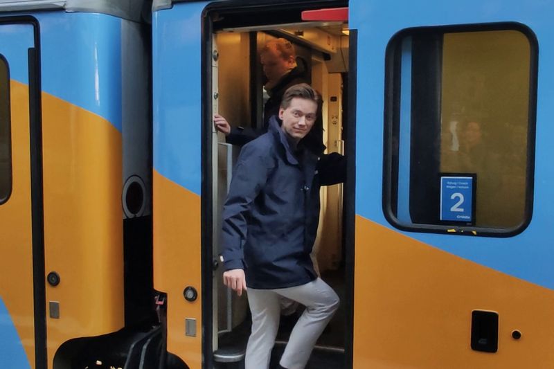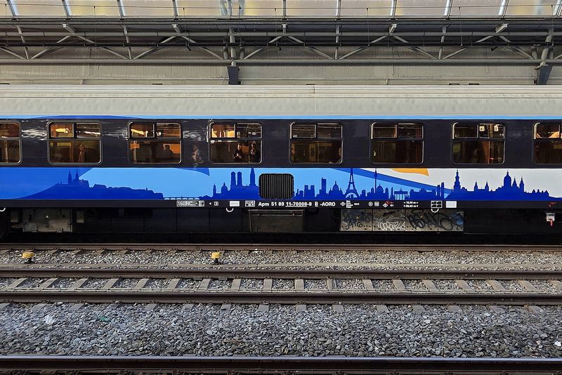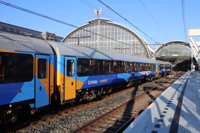De eerste internationale trein van GoVolta vertrekt uit het zonnige Amsterdam, met op de achtergrond het gevleugelde wiel, op weg naar Berlijn.