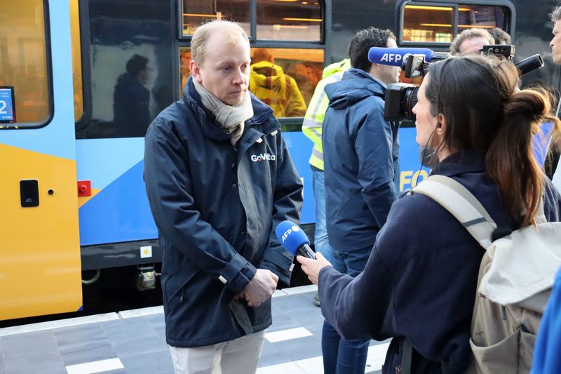Medeoprichter van GoVolta Maarten Bastian wordt geïnterviewd door een verslaggever van AFP.