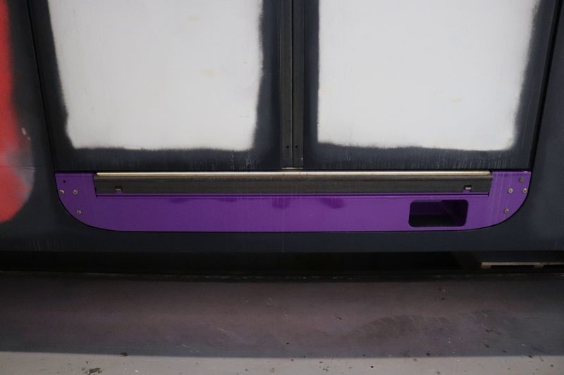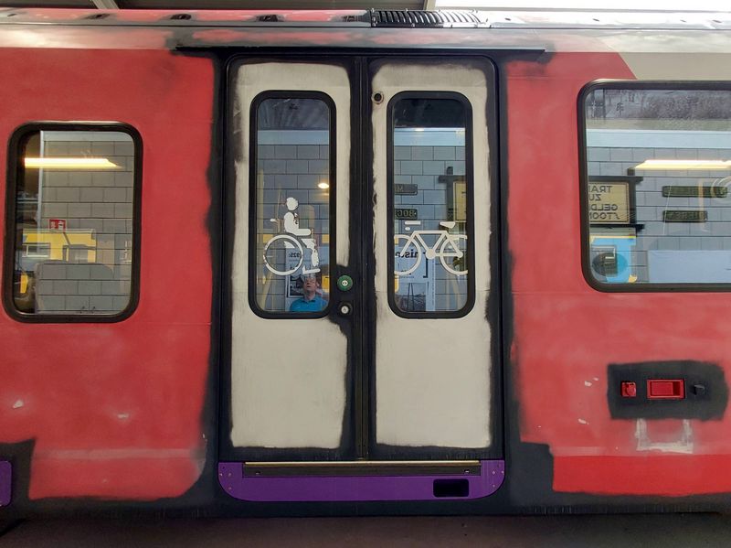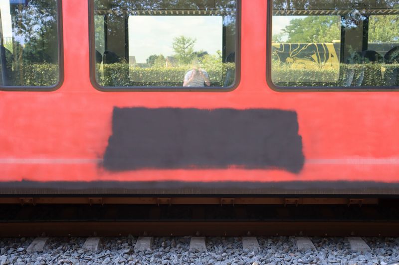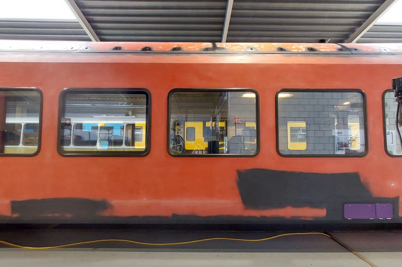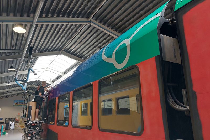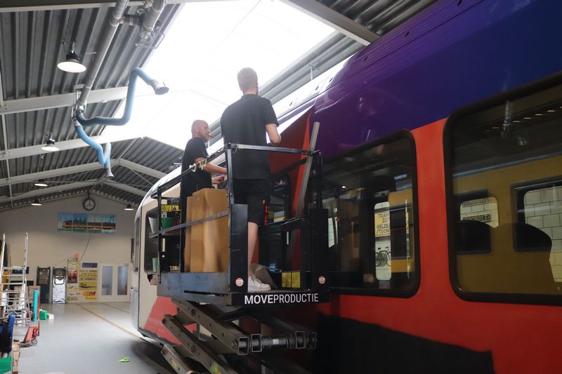 Het omstickeren vond een tijdlang in de treinwerkplaats van Transit-Oost plaats. Tegenwoordig gebeurt dit in Amersfoort. Wij hebben het omstickeren bij Transit-Oost een keer vastgelegd. |