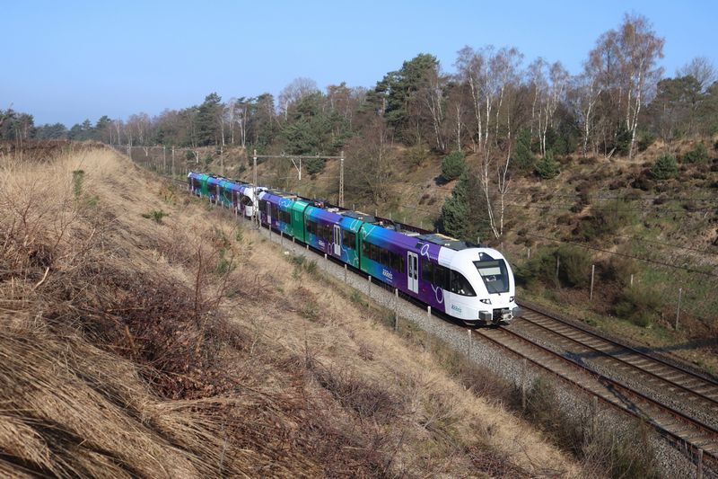 Op zondag 22 maart werd de laatste wit-rode GTW van Arriva, de 368, naar Amersfoort gebracht om de nieuwe RRReis-huisstijl te krijgen. Voor detectie reed vanuit Zutphen via Deventer naar Amersfoort de RRReis 374 mee. Op de terugweg uit Amersfoort reed de vers bestickerde 373 voorop terug naar Zutphen. Op de foto rijden de RRReis 373 en 374 door de Veluwe ter hoogte van de ingraving bij Assel naar Zutphen. |