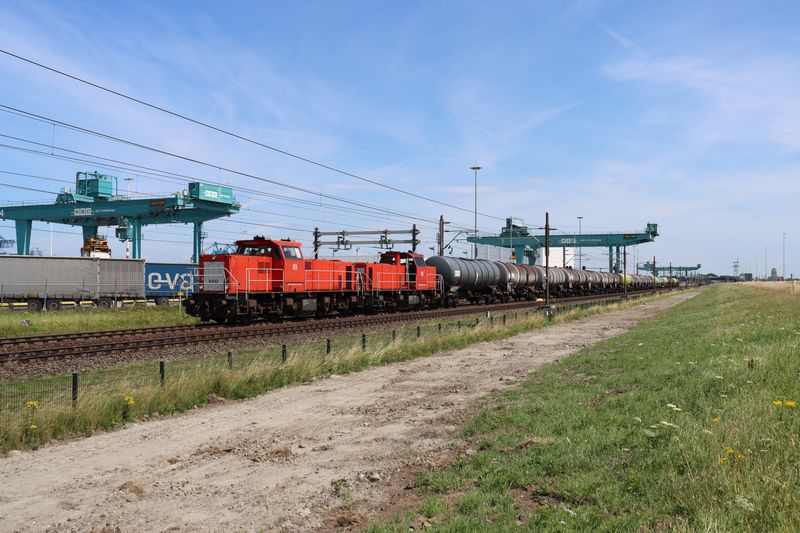 De DB Cargo 6432 en de 6430 rijden met een keteltrein over de Havenspoorlijn ter hoogte van de RSC-terminal richting Pernis. 12 juli 2025. © TreinenInNederland.nl |