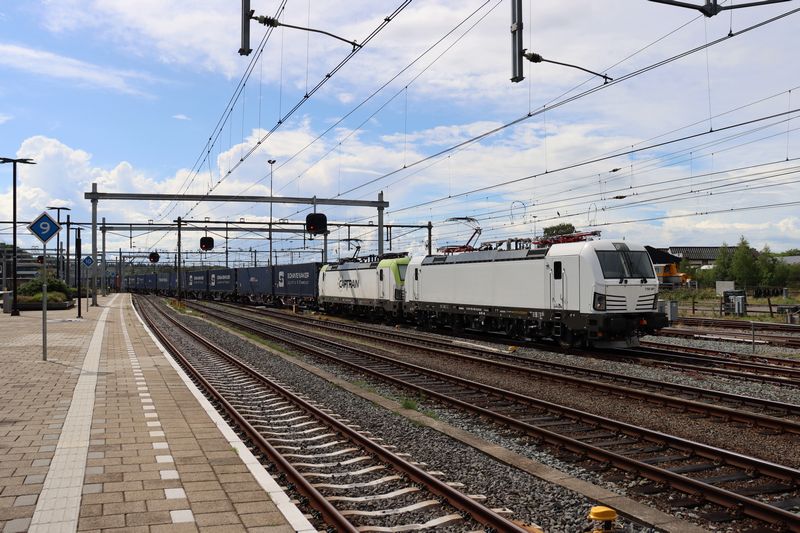 De RFO 7193 881 en de 6193 784 rijden met een goed beladen containertrein Amersfoort Centraal binnen vanuit Lage-Zwaluwe. 21 juli 2025. © TreinenInNederland.nl |