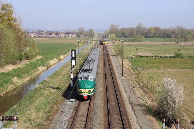 De 766 rijdt vanuit Arnhem Goederen Opstel NS, waar het treinstel een lange tijd stond opgesteld, naar Maastricht. Hier zou het treinstel na klein onderhoud weer haar eerste donateursrit sinds jaren rijden. Deze donateursrit is echter niet doorgegaan. 11 april 2025. © TreinenInNederland.nl |