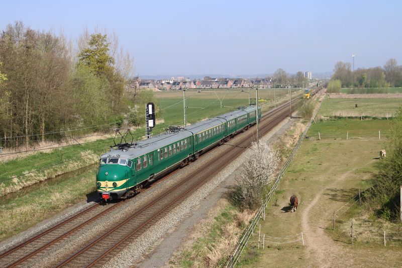 Op 24 april 2021 reed de 766 vanuit Nijmegen via Arnhem en Deventer naar Apeldoorn. In Apeldoorn werd de modeltrein Artitec Hondekop 766 gepresenteert. Op de foto passeert de museumtrein Velp. © TreinenInNederland.nl |