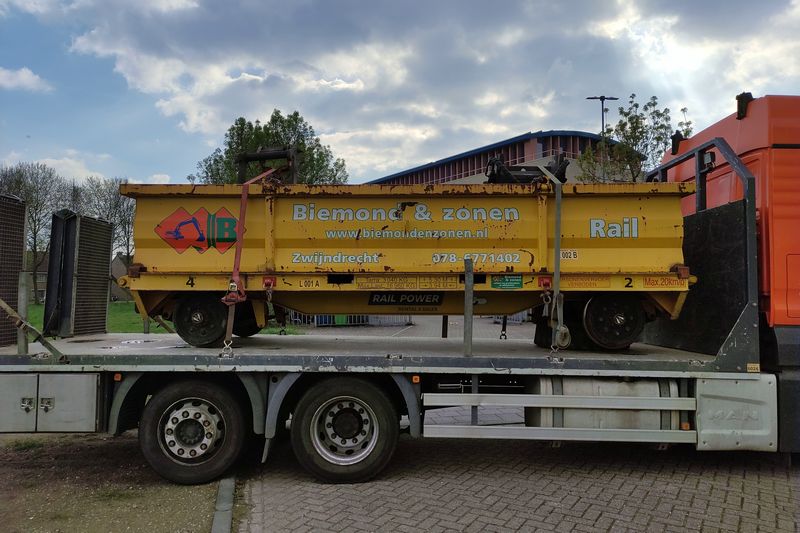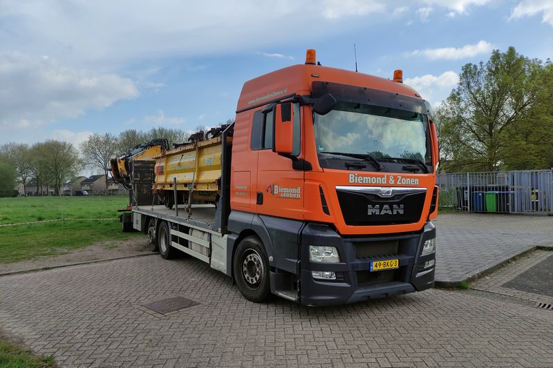 Een vrachtwagen van Biemond & Zonen staat met de bakwagen 1 en een