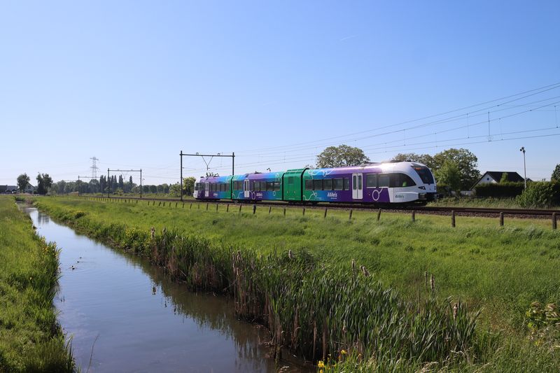 De 374 rijdt langs Het Hazeland in Westervoort richting Arnhem. 10 mei 2025. © TreinenInNederland.nl |
