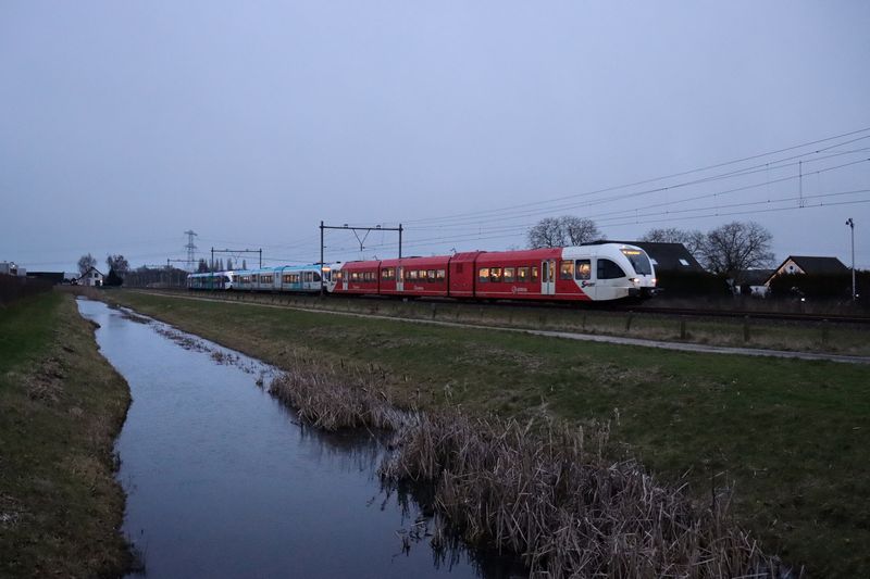 GTW's 375 en 253 passeren elkaar in de avond te Duiven. 18 april 2021. © TreinenInNederland.nl |