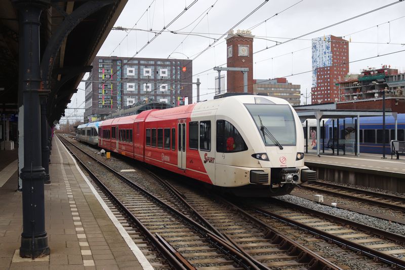 De rode 373 en ex-Breng 394 komen tijdens de carnaval als versterking op de Maaslijn rijden. Op de foto passeren de treinstellen te Nijmegen de donkerblauwe 280 en 390 die als stoptrein naar Roermond klaar staan. 17 februari 2026. © TreinenInNederland.nl |
