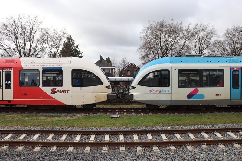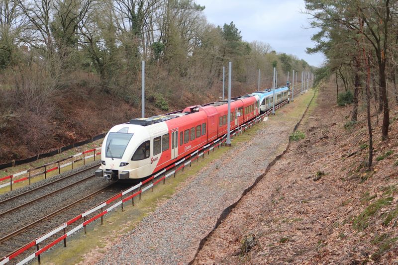 De ex-Breng 394 en de rode 373 vertrekken uit Mook-Molenhoek naar Nijmegen. 17 februari 2026. © TreinenInNederland.nl |
