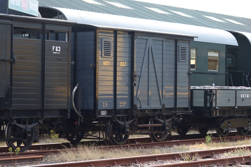In de eerste jaren dat de stoomtrams sinds 1 juli 1879 in Nederland reden, werden rijtuigen en goederenwagons in dezelfde trams vervoerd. Het laden en lossen van de goederen kostte voor de reizigers veel reistijd. Mede hierdoor en het toenemende goederenvervoer besloot de Nederlandsche Tramweg-Maatschappij (NTM) in Friesland aan het begin van de 20e eeuw om aparte reizigers- en goederentrams te gaan rijden. Voor het rijden van de goederentrams bestelde de NTM een grote hoeveelheid goederenwagons. De NTM was het grootste stoomtrambedrijf in Nederland dat het grootste deel van Friesland en enkele trajecten naar Drenthe, Groningen en Overijssel exploiteerde. De gesloten goederenwagon E67 uit 1911 en de veewagen F63 uit 1913 (beide behoren tot de collectie van de Museumstoomtram Hoorn - Medemblik) maken hier deel van uit. Naast de grote hoeveelheid nieuwe goederenwagons werden in de jaren 1905 t/m 1915 zeven oude post-bagagewagens uit de jaren 1888-1897 omgebouwd naar conducteurswagens. De P1 uit 1888 (tevens ook prachtig gerestaureerd door de SHM) is een van de wagons die werd omgebouwd. In de conducteurswagens werd de administratie bijgehouden. In de jaren '30 ging het vanwege de concurrentie met het wegverkeer erg slecht met de lokaalspoorlijnen en interlokale tramlijnen in Nederland. Na de Eerste Wereldoorlog reden de eerste bussen in Nederland, die fel concurreerden met de trams. Naast bussen waren personenauto's, fietsen en vrachtwagens in opkomst en wonnen ze steeds meer terrein van het spoor. Trambedrijven waren sinds de Eerste Wereldoorlog bezig om stoomlocomotieven te vervangen door goedkopere benzine-, diesel- of elektrische trams om beter te kunnen concurreren. In de jaren '30 stapten veel trambedrijven over op nieuwe bussen of gingen ze failliet. Doordat veel bedrijven het financieel niet meer redde, besloten ze samen te voegen tot grotere bedrijven. In de jaren '30 sloten door heel Nederland veel lokaalspoorlijnen en interlokale tramlijnen. Tijdens en kort na de Tweede Wereldoorlog beleefden de (stoom)trams, door de schaarste aan olie en benzine, een korte opleving. De tramlijnen sloten echter na de oorlog voor het reizigersvervoer. Een deel van de tramlijnen (met een spoorbreedte van 1435 mm 'normaalspoor') werd door de Nederlandsche Spoorwegen overgenomen. De NS reed tot in de jaren '60 en '70 met goederenvervoer over de spoorlijnen. Later werden deze lijnen toch gesloten door de concurrentie met de vrachtwagen of het wegvallen van het vervoer. De Nederlandse Spoorwegen hebben altijd, en doen dat nu nog steeds, vrijwel al hun terzijde gestelde materieel laten slopen waardoor er relatief weinig voor spoorwegmusea bewaard is gebleven. Doordat tijdens de wederopbouw vele rijtuigen en goederenwagons buiten de spoorwegen een tweede leven hebben gevonden, zijn tientallen van deze rijtuigen en goederenwagons bewaard gebleven. Spoorwegmusea hebben deze treinen teruggevonden en hebben ze kunnen restaureren zoals ze vroeger bij de spoorwegen dienst hebben gedaan. Hierdoor zijn er bijzondere rijtuigen en goederenwagons bewaard gebleven die anders waren gesloopt. Vele van deze bewaarde treinen hebben later vanwege hun historische waarde de hoogste A-status toegekend gekregen binnen het Nationaal Register Railerfgoed. De rijtuigen NS BC423, NS BC425, NS BC455, NS C1040, NS C1137, NS B1605, NS C7032, NTM C205, SBM AB24 en Z.V.T.M. AB8 werden na de oorlog als woningen gebruikt en zijn hierdoor bewaard gebleven. Het rijtuig RTM AB334 heeft ook als woning gediend, maar werd daarvoor eerst nog als douanekantoor gebruikt. Het rijtuig ZE AB6 en een eerste klas rijtuig van de ZNSM werden als tuinhuisjes gebruikt. De goederenwagons EDS 85, N.H.T.M. 21, NTM E67, NTM E128, NTM E134, NTM F63, O.G. E102, NS 1524, USATC 224340, USATC 220410 en NS-rijtuig AB7216 werden als schuren of opslagruimtes gebruikt en zijn daardoor niet gesloopt. De goederenwagons NS CHD 8681 en NTM conducteurswagen P1 werden als stal voor dieren gebruikt. De NTM post-bagagewagen D6 heeft een tweede leven gekregen als kantoor. De rijtuigen NS B1813 en NS C1820 werden respectievelijk als eet- en verblijfsruimte en als slaapzaal gebruikt bij een vakantieverblijf. Het rijtuig NS C6478 werd op een kinderspeelplaats neergezet en is hiermee bewaard gebleven. De NTM beëindigde in 1947 en 1948 het reizigersvervoer op haar tramlijnen. Een groot deel van de rijtuigen werd overgenomen door de Nederlandsche Spoorwegen en elders in Nederland ingezet. Nadat de NTM het reizigersvervoer op de tramlijnen beëindigde, nam NS in 1948 de exploitatie van het goederenvervoer over. Hiervoor nam NS een deel van de locomotieven en goederenwagons van de NTM over. Het materieel dat NS niet overnam, werd in 1947 en 1948 door de NTM terzijde gesteld. In 1949 nam de NTM de overgebleven spoorlijnen weer over van de NS; het materieel bleef echter wel eigendom van de NS. De NTM stelde de E67 in 1948 na 37 dienstjaren buitendienst en verkocht hem aan de Fa. E.W. Smit. Hier diende de wagon als schuur. In 1954 werd de wagon weer verkocht en naar Munnekeburen gebracht. Hier werd de wagon ook als schuur gebruikt. In 2000 werd de NTM E67, die al 52 jaar als schuur diende, door de familie Nijdam aldaar aan de Museumstoomtram Hoorn - Medemblik geschonken. Tussen 2007 en 2010 werd de wagon gerestaureerd en hij is sindsdien te zien op de spoorlijn van de SHM. De NTM Veewagen E67 heeft vanwege haar cultuurhistorische waarde de hoogste A-status toegekend gekregen binnen het Nationaal Register Railerfgoed. |