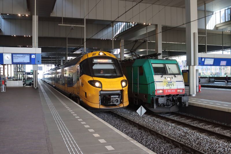 De ICNG 3227 staat naast de Traxx 186 024 in Den Haag Centraal. 9 december 2023. © TreinenInNederland.nl |