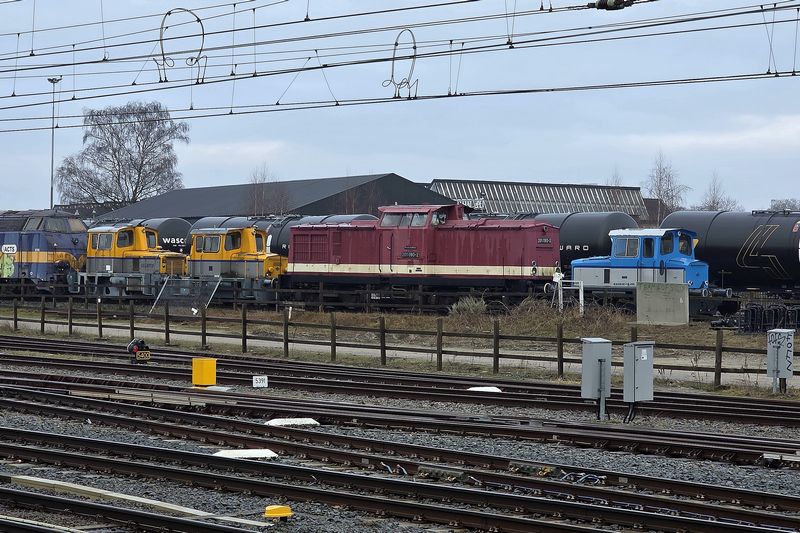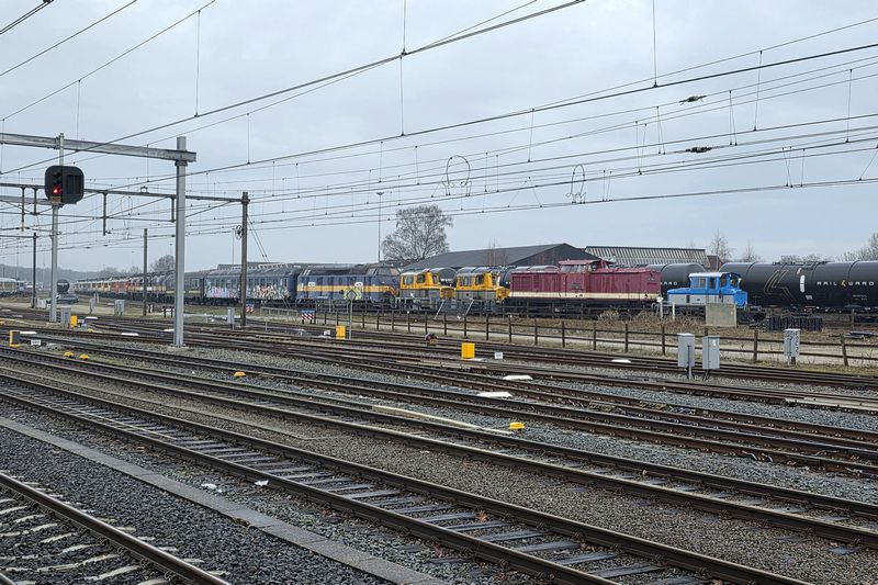 Een lange rij aan materieel, dat grotendeels in eigendom is van Railexperts, staat in Amersfoort. 1 februari 2026. © TreinenInNederland.nl |
