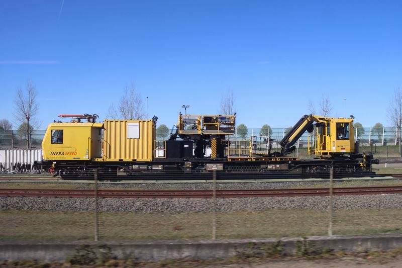 De Infraspeed Bovenleidingsmontagewagen 99 84 2130 002-6 staat ter hoogte van Lage-Zwaluwe langs de HSL opgesteld. 6 april 2025. © TreinenInNederland.nl |