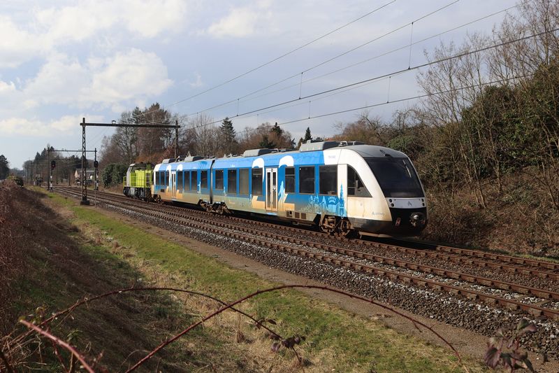De ÖBB Rail Cargo Group 1375 rijdt met de Arriva Lint 28 door Rheden naar Zutphen. 27 februari 2026. © TreinenInNederland.nl |