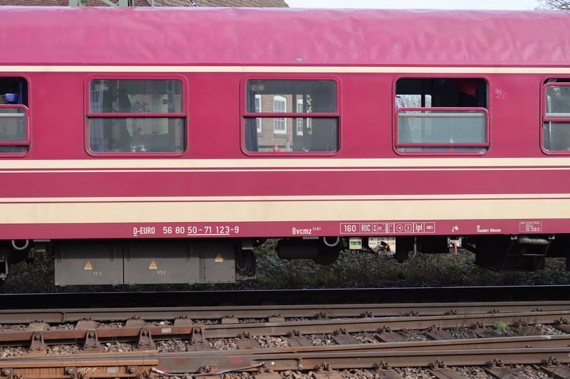 De 186 293 vertrekt met de TUI Ski Express vanuit Emmerich richting Amsterdam. Op de foto staat een rijtuig van het type Bvcmz248.1 met het UIC-nummer 56 80 50-71 123-9. 10 maart 2024. © TreinenInNederland.nl |