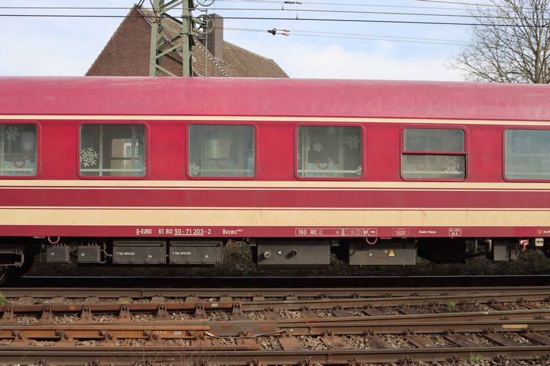 De 186 293 vertrekt met de TUI Ski Express vanuit Emmerich richting Amsterdam. Op de foto staat een rijtuig van het type Bvcmz248.3 met het UIC-nummer 61 80 50-71 203-2. 10 maart 2024. © TreinenInNederland.nl |