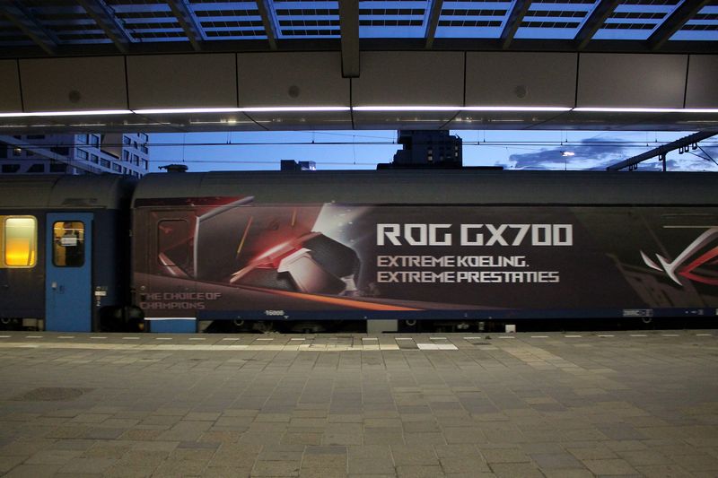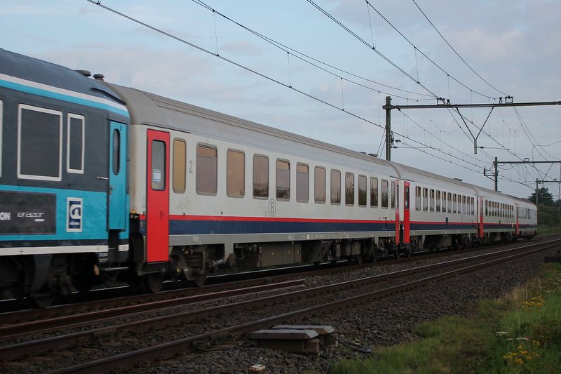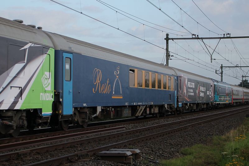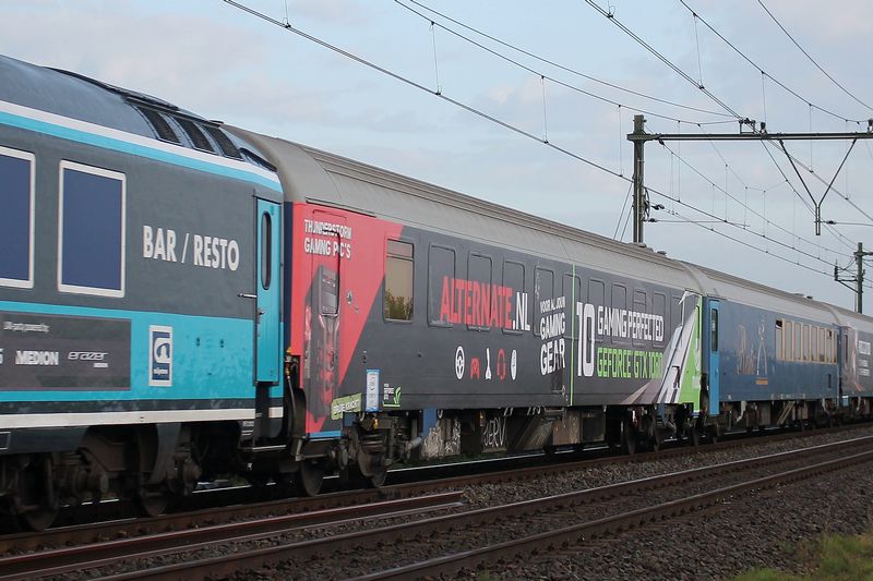 De door Railpromo gehuurde NMBS 2825 rijdt met een sleep bestickerde rijtuigen door Schalkwijk richting Venlo en verder naar Köln Messe-Deutz voor het evenement Gamescom. Op de foto is een bestickerd NMBS-rijtuig te zien van de serie I10 met het UIC-nummer 61 88 88-90 007-2. 20 augustus 2016. © TreinenInNederland.nl |