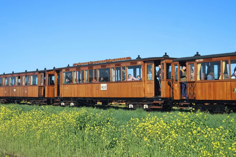 De SHM 30 rijdt met acht rijtuigen tussen Wognum-Nibbixwoud en Twisk ter hoogte van de Broerdijk als tulpentram. |