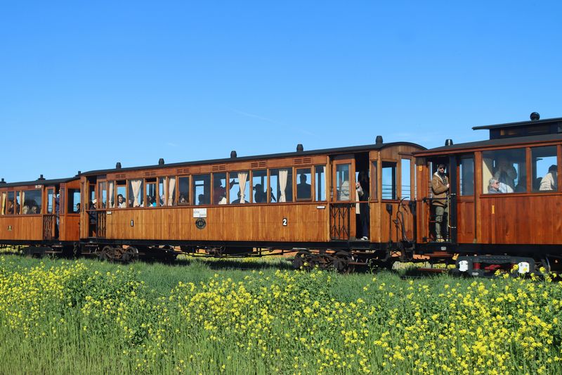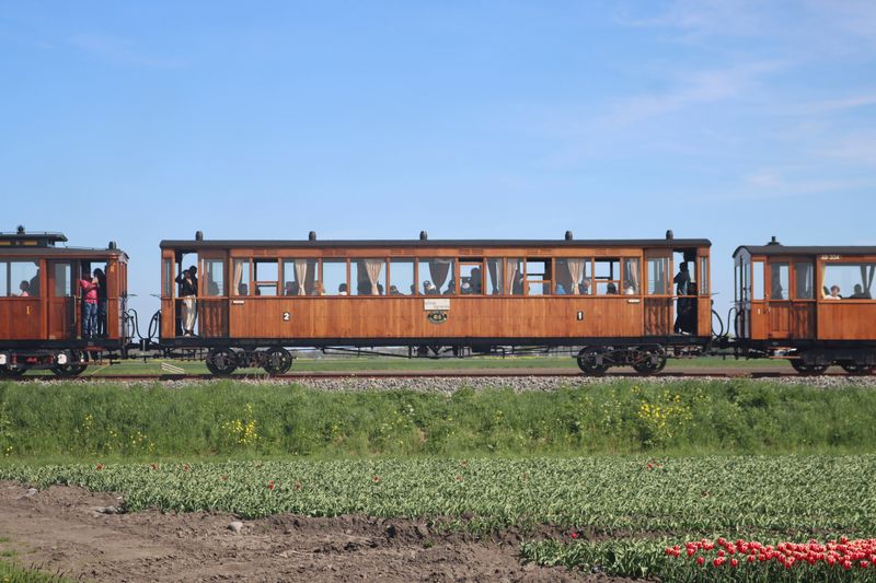 De SHM 30 rijdt met acht rijtuigen tussen Wognum-Nibbixwoud en Twisk ter hoogte van de Broerdijk als tulpentram. |