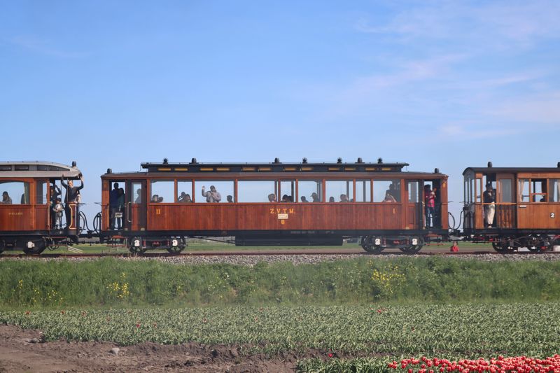 De SHM 30 rijdt met acht rijtuigen tussen Wognum-Nibbixwoud en Twisk ter hoogte van de Broerdijk als tulpentram. |