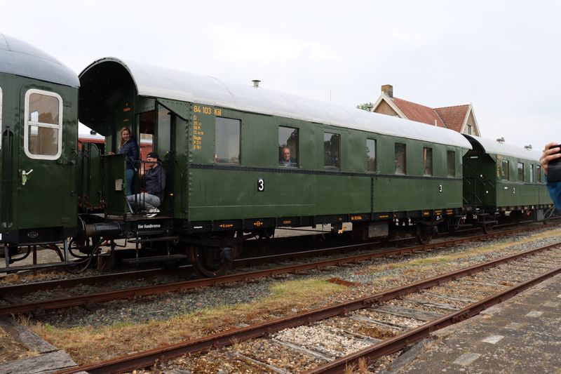 De 84 103 staat in een reizigerstrein te Stadskanaal langs het perron. Nationale Stoomtreindag