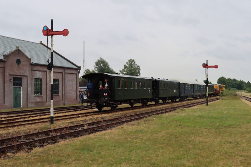 De 52 8060 rijdt met een reizigerstrein Stadskanaal binnen. Op de foto is rijtuig 91 626 van de STAR te zien. Nationale Stoomtreindag 2025 bij de Museumspoorlijn STAR, 29 mei 2025. © TreinenInNederland.nl |