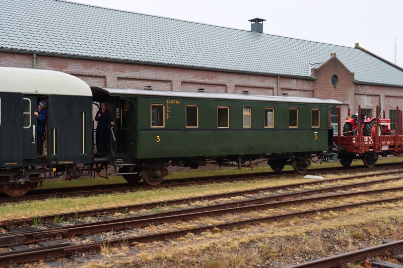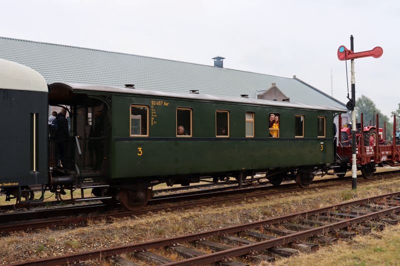 De 52 8082 rangeert in Stadskanaal met rijtuig 92 457. Nationale Stoomtreindag