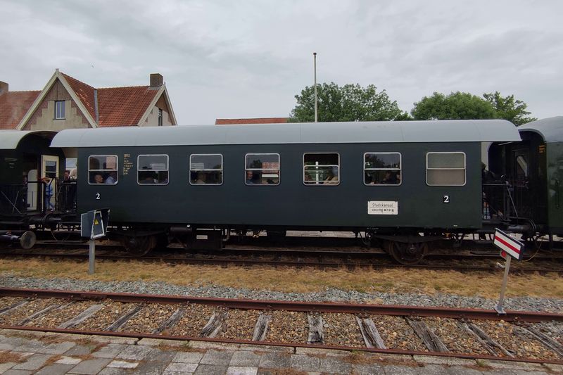 De B112 staat in een reizigerstrein te Stadskanaal langs het perron. Nationale Stoomtreindag