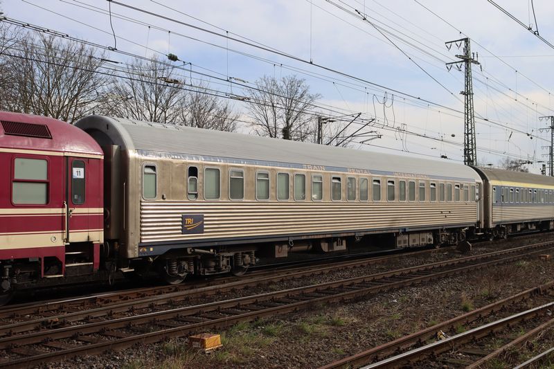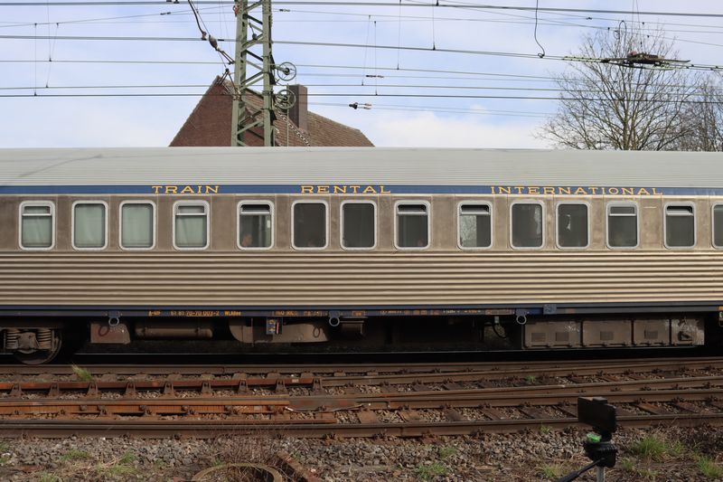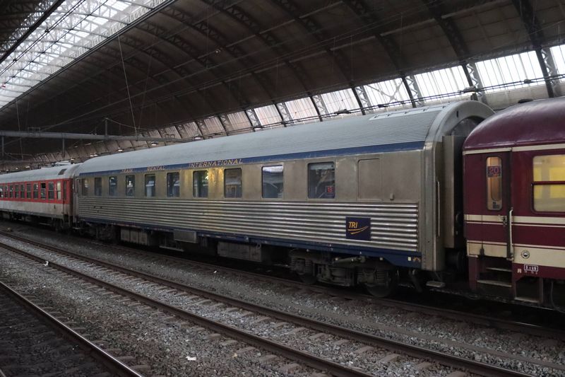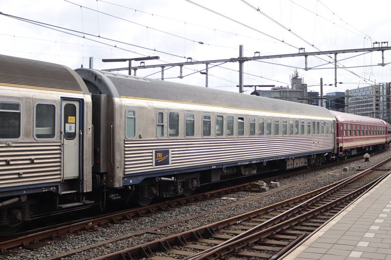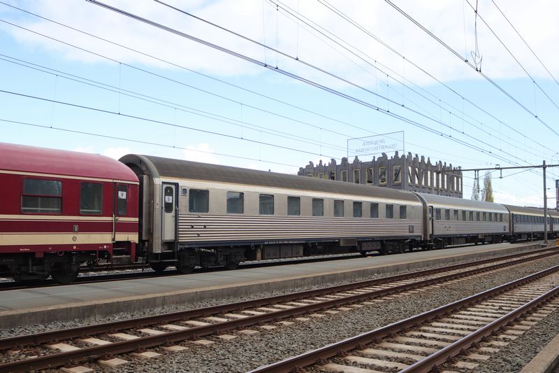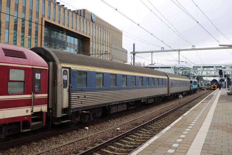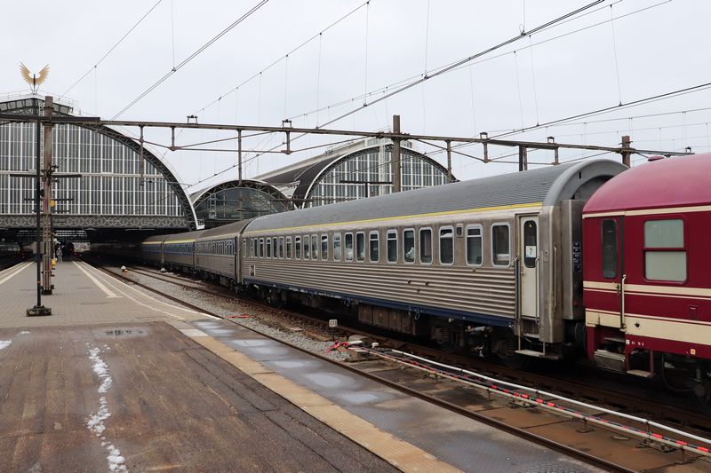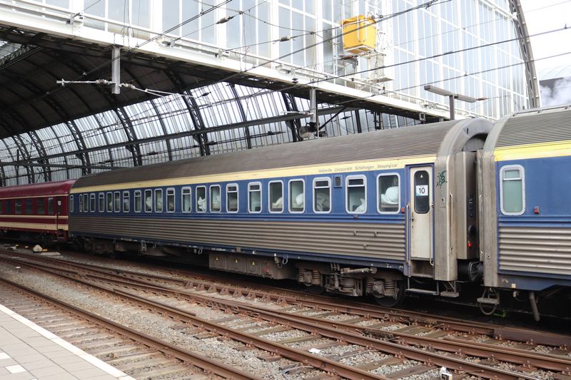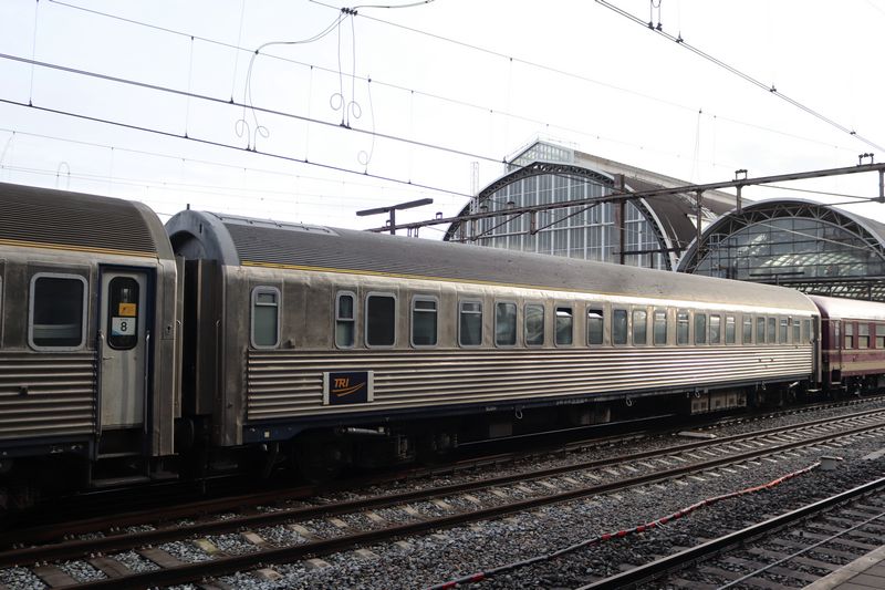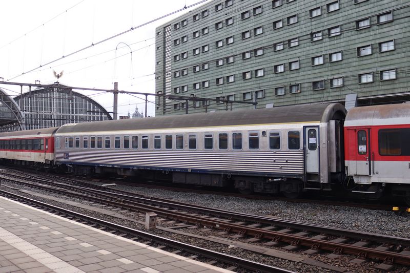 Een WLABee-rijtuig met UIC-nummer 61 81 70-70 004-0 van Gesellschaft für Fahrzeugtechnik rijdt mee in de European Sleeper Praag - Brussel. De foto toont het uit de jaren '50 stammende rijtuig in Amsterdam Centraal. 16 april 2025. © TreinenInNederland.nl |