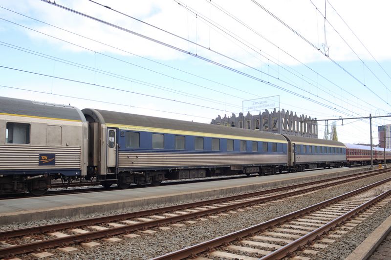 De TCS 189 115 staat met de GreenCityTrip naar Milaan station te Arnhem Centraal. Direct achter de locomotief reed een rijtuig van het type WLABm mee met het UIC-nummer 61 81 70-70 010-7. 19 oktober 2021. © TreinenInNederland.nl |