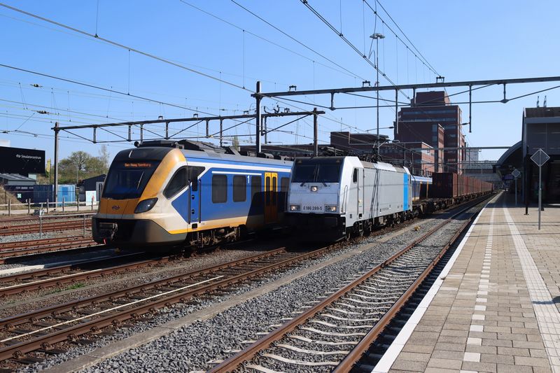 De 3010 en de blauwe 2749 komen Arnhem Velperpoort binnen gereden. 27 april 2022. © TreinenInNederland.nl |