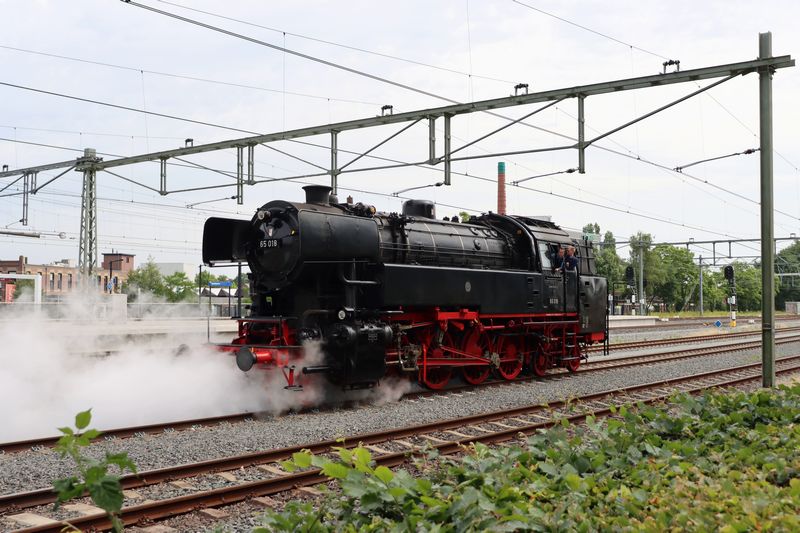 Na de Tweede Wereldoorlog was er in Duitsland behoefde aan nieuwe stoomlocomotieven. Electrische en diesel locomotieven werden niet als betrouwbaar genoeg gezien en waren te duur. Er werden meerdere series locomotieven gebouwd, waaronder de BR 23 en de BR 65. De Baureihe 65 018 is in 1956 gebouwd door Krauss Maffei in Munchen. De BR 65 werd vooral ingezet in het Ruhrgebied voor het trekken van zowel personen als lokaal goederenverkeer. Door de kleine voorraden in de locs van de serie BR 65 konden ze geen goederentreinen over grote afstanden rijden. De locomotieven bewezen zich als zeer betrouwbare locs. In de laatste jaren waren de locomotieven ook in Limburg opgesteld. In 1972 werd de 65 018 al terzijde gesteld door een verlopen ketelkeuring. Ze was toen pas 17 jaar oud. In 1975 werd de loc door de Deutsches Dampflokomotiv Museum (DDM) overgenomen. In 1981 kwam de loc bij de Stoom Stichting Nederland terecht. De loc werd voor 10 jaar gehuurd van het Deutsches Dampflokomotiv Museum. In 1991 werd de loc definitief gekocht van het museum. Van 1984 tot 1993 heeft de locomotief op het spoor gereden. In 1993 werd ze buitendienst gesteld in afwachting op een grote revisie. Dampflokwerk Meiningen gaf in 1997 de loc een revisie, in 1998 was de loc weer inzetbaar. De loc heeft vele jaren rondritten gereden voor de SSN. Op 17 november 2018 is de loc na zijn afscheidsrit, via Utrecht en Arnhem naar de VSM-lijn gereden. Hierna keerde hij weer terug naar Rotterdam. Daar werd de loc buitendienst gesteld. Een aantal onderdelen werden gebruikt om de 23 023 van de SSN weer rijvaardig te maken. Op 8 december 2018 werd bekend dat de VSM de loc voor 10 jaar in bruikleen neemt van de SSN. De 65 018 werd na de stoomtreindagen bij de SSN op 6 oktober 2019 door de VSM 23 071 en de 23 076 mee genomen naar Beekbergen. Daar is de loc weer rijvaardig gemaakt en heeft een nieuwe schilderlaag gekregen. Op vrijdag 1 oktober 2021 waren de VSM 23 071, 23 076 en 65 018 onderweg naar Rotterdam voor de SSN stoomtrein dagen die dat weekend werden gehouden. Na het weekend keerde alleen de 23 071 en 23 076 terug, de 65 018 bleef in Rotterdam om naar de kuilwielenbank te gaan. In de nacht van 22 op 23 oktober werden de VSM 65 018 en SSN 41 105 door de HSL 1324 naar Alstom (voorheen Shunter) op de Waalhaven gebracht. Op 29 oktober vertrokken beide stoomlocomotieven achter de KRE 186 493 naar Kijfhoek, waar de RXP 9901 de locs overnam en naar Rotterdam bracht. Op 21 november vertrok de 23 071 met twee rijtuigen vol met VSM-vrijwillergers richting Rotterdam om de 65 018 weer op te halen. In de avond was de 65 018 weer terug in Beekbergen en hadden de vrijwillergers een gezellige rit er op zitten. De 65 018 rijdt nu mooie ritten over de Veluwe. |