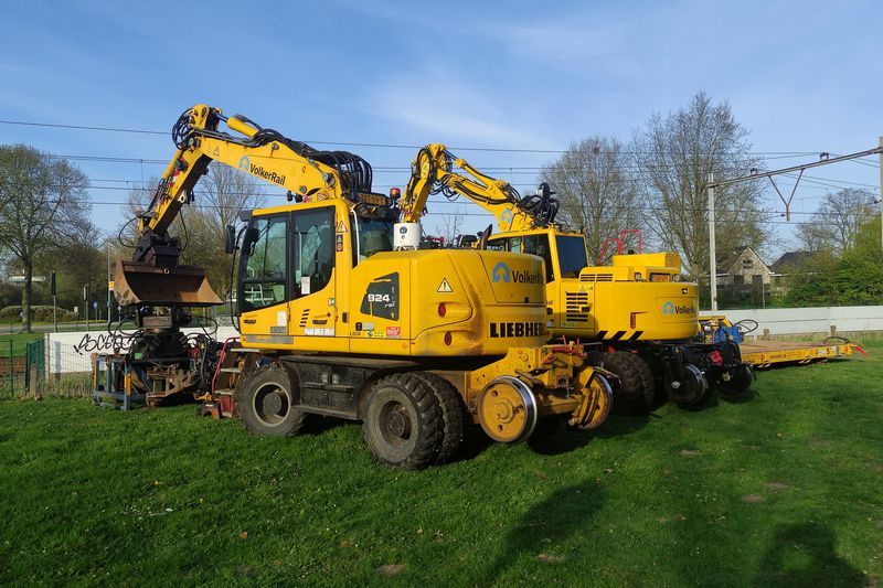 De VolkerRail Krollen met de kentekens TST-59-T en T-26-GPS staan in Duiven geparkeerd. 9 april 2025. © TreinenInNederland.nl |